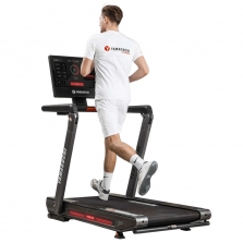 Идеальное соотношение рабочих характеристик с удобством конструкции достигнуто в дорожке для бега серии PRO-X. Бегун с комфортом занимается, благодаря работе системы амортизации движений, а также поручню с пневматической регулировкой опоры. Занимающийся решает, бегать ли ему при полном автоматическом контроле за тренажером или в ручном. Параметры действия задаются через пульт. Минимальная скорость движения составляет 1 км/ч, а максимальная не превышает 8 км/ч. Работу организма и нагрузки легко отследить на дисплее, там же контролируется скорость движения. Такт задается музыкой, передаваемой по Bluetooth на штатные колонки тренажера. Новые достижения в спорте гарантированы для тех, кто выбрал Yamaguchi Runway PRO-X.